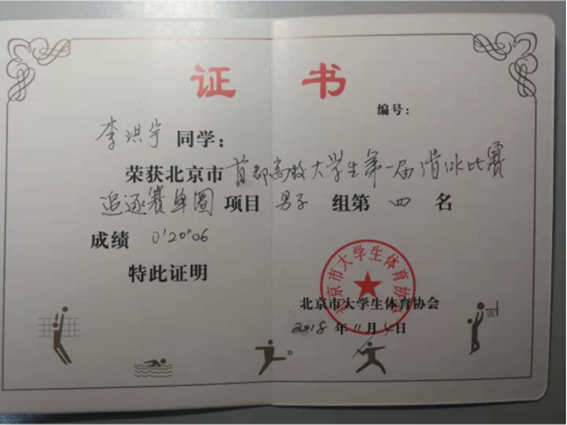 在体育部张嘉飞老师带领下我校派4名队员首次参加比赛,17级信息与电子学院李洪宇和王云川、17级计算机学院陈家胤三名同学参加单圈计时赛分别取得第5名、9名和17名成绩,17级设计与艺术学院缪徐涛同学参加两圈追逐赛取得第11名成绩,为我校今后参加首都高校冰上项目比赛积累了宝贵赛事经验,对学校冰上项目俱乐部组建、冰雪校内赛事组织具有积极推动作用。
