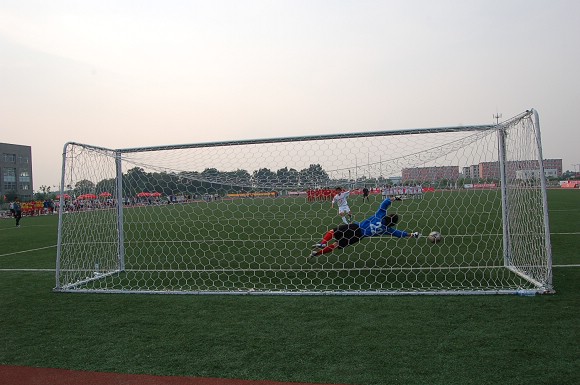 东华大学在罚第四轮点球时,罚球队员高度紧张,犹豫不决,射出点球低平偏正且力道不足,我方守门员王毅判断准确将球扑出。