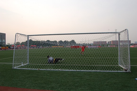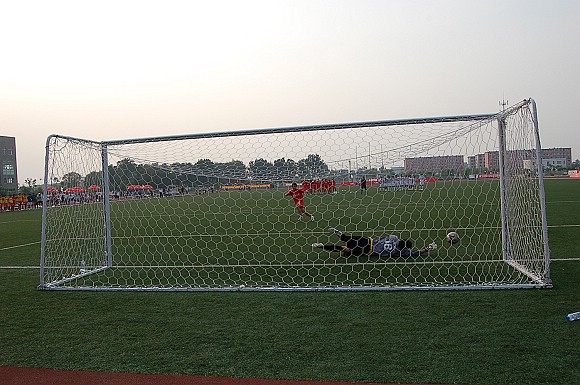 在紧张而又激烈的点球大战中,我校足球队率先罚球,首先由“点球专家”6号队员于飞首罚,他骗过了对方守门员,直接命中网底。