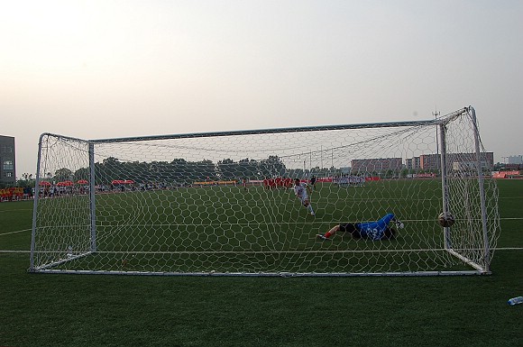 第四轮罚球,我方由8号队长袁微出场,他巧妙骗过对方守门员,点球命中。