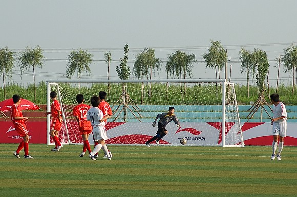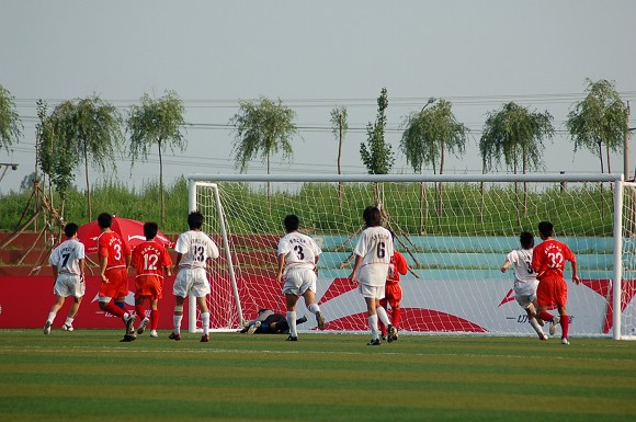 下半场开始后20分钟过后,双方在场上展开了一场惊心动魄的进球大战。首先是我方11号前锋王强在第23分钟时利用角球的机会头球攻门,皮球射入左门柱附近死角,守门员虽尽力扑救,但无奈鞭长莫及。场上比分变为2:0。