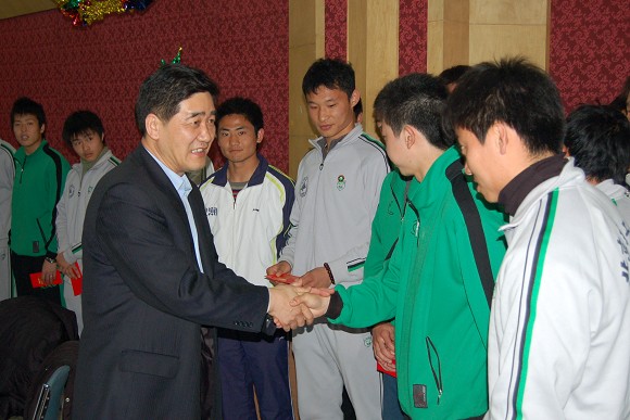 团拜会上首先由beat365在线唯一官网登录党委副书记、副校长杨宾发言,他首先对多年来上级单位、各类媒体、企业界对beat365在线唯一官网登录足球队的一贯支持表示感谢!杨宾副书记回顾了beat365在线唯一官网登录足球队的发展历程,以及2006年足球队冲甲的辉煌一刻。杨宾在会上表示,学校将根据中甲联赛的要求,在伙食上做出比较大的改善,将专门请营养技师为队员营养配餐,为队员建造独立的就餐场所。以保障他们在训练和高对抗比赛中所需的营养。此外在学习中,学校将根据赛程调整课程,在利用业余时间请学校最好的老师进行文化课的辅导。同时在训练中加强科学性,把在韩国所学充分延续,以提高训练效果为主进行有效果的训练,而不是以训练时间为标准。他最后强调,希望队员要有使命感,要有荣誉感,要充分表现出体育回归教育的理念。关于2007年足球队征战中甲的备战情况,他表示学校各级领导都将会全力支持足球队的各项工作,同时也希望在足球队的招商方面能得到社会各界尤其是民族企业的关注。