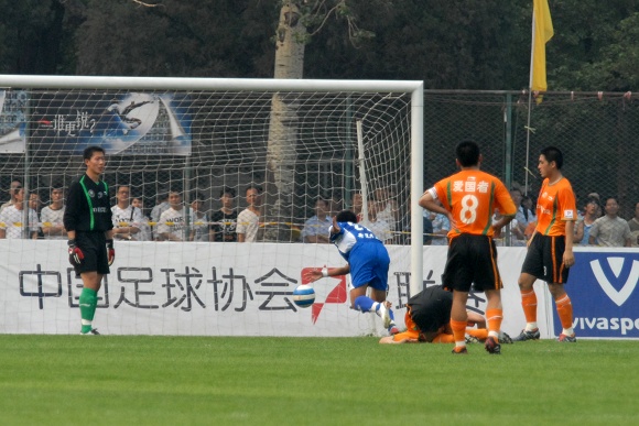 学生军并没有被暂时的胜利冲昏头脑,他们抓住机会,乘胜追击,在一分钟后金俊植利用广州医药球门再次失守抢在戴宪荣出脚前铲射,又立即攻入一球。爱国者大学生队2比0领先广州医药队!