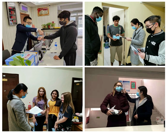 春节,本是家人团聚的日子。而疫情发生后,很多订好车票准备回家过年的公寓管理人员毅然退票,主动提出放弃休假,决心继续坚守岗位。公寓经理滕飞一天驱车1400公里迅速返岗,第一时间落实防控任务、合理排班上岗、筹措抗疫物资,做好各项后勤保障。“心里牵挂着这些外国孩子,我们知道疫情很严峻,所以这个时候我们绝不能休息。在与大家一起奋战的日子里,度过了我人生中最难忘的生日。”公寓副经理肖忠建诚挚的话语代表了全体公寓管理人员的心声和决心。全体管理人员承诺要坚守岗位、绝不掉队,全身心投入到疫情防控工作中。