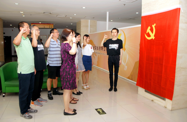 讨论结束后,全体党员在组织委员赵琳的带领下面对党旗再次重温入党誓言,将此次的主题活动推向高潮。