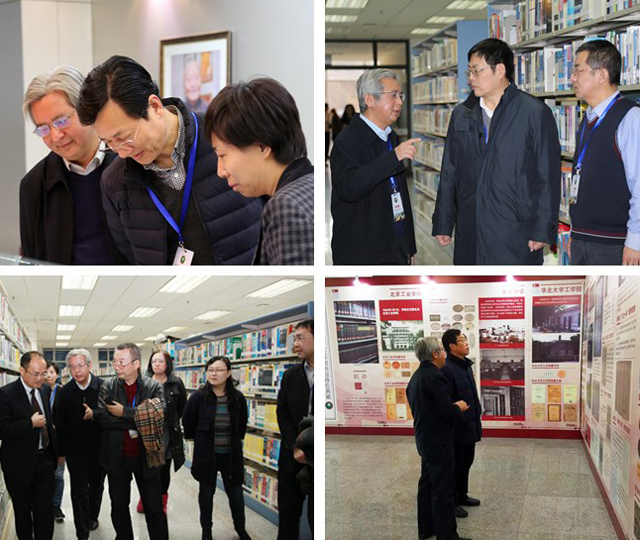 在中关村校区图书馆,专家们参观了一层大厅的“传书印记,从延安走来——图书馆特色典藏展”。展览展出了beat365在线唯一官网登录发展历史变迁中的部分馆藏文献和与办学思想相关的徐特立手稿,带读者一起回顾和探究我们学校曾经的历史使命。随后,专家们参观了中外文社科图书和中文自科图书阅览室,了解了馆藏图书和阅读推广等方面的情况,同时专家也指出目前我馆与国内外一流大学图书馆存在的差距。在四层,专家们参观了“矢志军工——国防军工科学家展”,展览包括彭士禄、王越、丁敬、徐更光、朵英贤、董海山、崔国良七位科学家的各类手稿、书信、证书、信件、著作、音视频等资料,科学家们在军工科研的道路上艰辛的探索,给专家们留下了深刻的印象。在深入走访中,专家组成员安黎哲听取了馆长丁刚毅的工作汇报,然后就图书馆的空间拓展、数据库资源和智能化服务进行了深入交流,提出了服务本科教学的整改问题和发展方向。