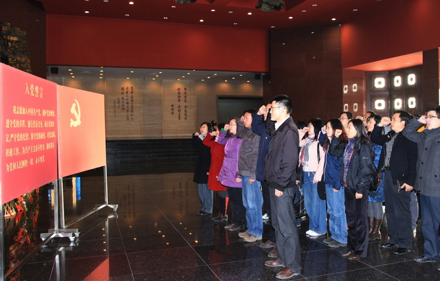 入党宣誓暨重温入党誓词仪式在中国人民抗日战争纪念馆大厅举行。面对神圣的烈士浮雕和庄严的中国共产党党旗,全体党员进行了宣誓。宣誓场面庄严、神圣,全体党员声音洪亮、神情庄重,深刻表达了对党的崇敬和热爱之情。通过宣誓,新党员的思想得以升华,共产主义信念更加坚定。重温入党誓词,让老党员再次感受到了入党时的政治激情,激励党员以自身的实际行动去践行誓词,永葆共产党员的先进本色。