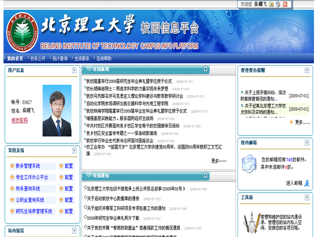 * 单点登录:将校内各个常用办公系统集中链接,并实现“一次配置,永久登录”功能