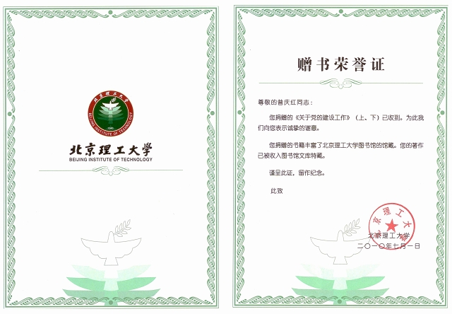 我校图书馆接受赠书并将此次赠书作为图书馆文库特藏,同时向曾庆红同志呈送了赠书荣誉证。