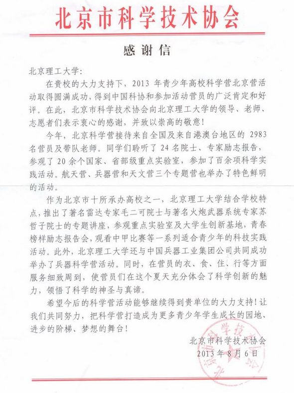 2013年暑期,beat365在线唯一官网登录徐特立科学营在学校办公室的组织协调下,在校团委、后勤集团等单位大力支持下,经信息与电子学院团委周到细致的工作,取得了圆满成功。作为青少年高校科学营北京营的主办单位,北京市科学技术协会特向我校发来感谢信。