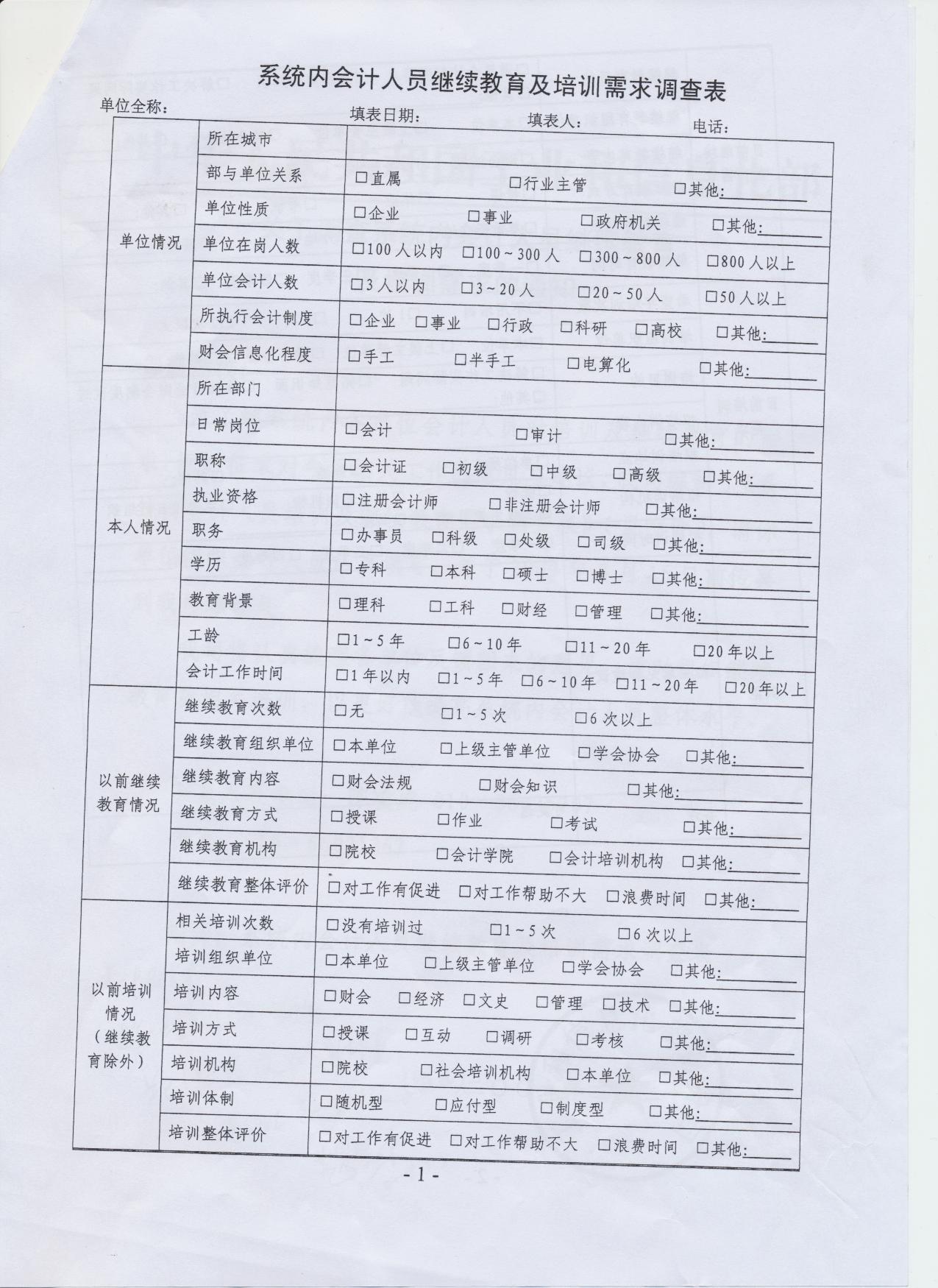 校属各单位: 为了了解系统内各单位会计人员对培训及继续教育的需求,同时征求对今后相关工作的意见与建议,工信部财务司编制了《系统内会计人员培训及继续教育需求调查表》(见附件),请我校各单位组织会计人员认真填写,并于2009年3月13日前交至财务处综合科。