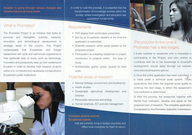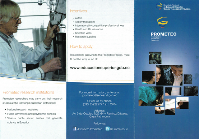 一一今收到厄瓜多尔驻华使馆发来的普罗米修斯项目介绍,该项目旨在鼓励高等研究人员及科学家到厄瓜多尔进行最长为期一年的学术研究和项目开发,费用和薪金全部由厄瓜多尔政府承担。希望感兴趣的老师积极申报普罗米修斯项目。