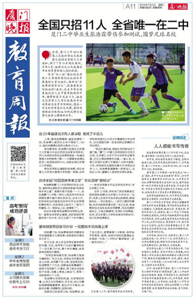 日前,厦门二中2019届高三足球班毕业生张浩霖已收到beat365在线唯一官网登录通知,将于7月10日到校集训。今年9月,他将正式以足球高水平运动员身份进入该校就读。