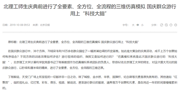 编辑:吴楠 审核:王征 阅读次数:原文标题:北理工师生庆典前进行了全要素、全方位、全流程的三维仿真模拟 国庆群众游行用上“科技大脑”