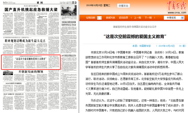 10月14日,教育部思想政治工作司和北京市委教育工委联合召开了“小我融入大我,青春献给祖国”首都高校师生服务保障国庆活动座谈会,来自北京大学、清华大学、中国人民大学等高校的师生代表分享了各自在此次服务保障国庆活动中的所感所得。