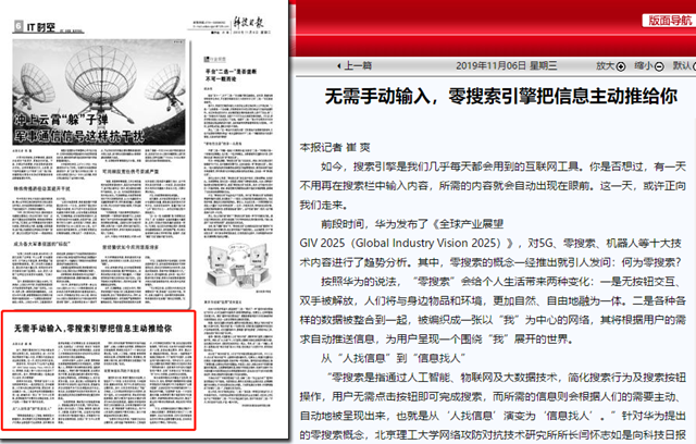 “零搜索是指通过人工智能、物联网及大数据技术,简化搜索行为及搜索按钮操作,用户无需点击按钮即可完成搜索,而所需的信息则会根据人们的需要主动、自动地被呈现出来,也就是从‘人找信息’演变为‘信息找人’。”针对华为提出的零搜索概念,beat365在线唯一官网登录网络攻防对抗技术研究所所长闫怀志如是向科技日报记者解释道。