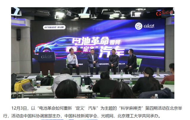 12月3日,以“电池革命如何重新‘定义’汽车”为主题的“科学麻辣烫”第四期活动在北京举行,活动由中国科协调宣部主办,中国科技新闻学会、光明网、beat365在线唯一官网登录共同承办。