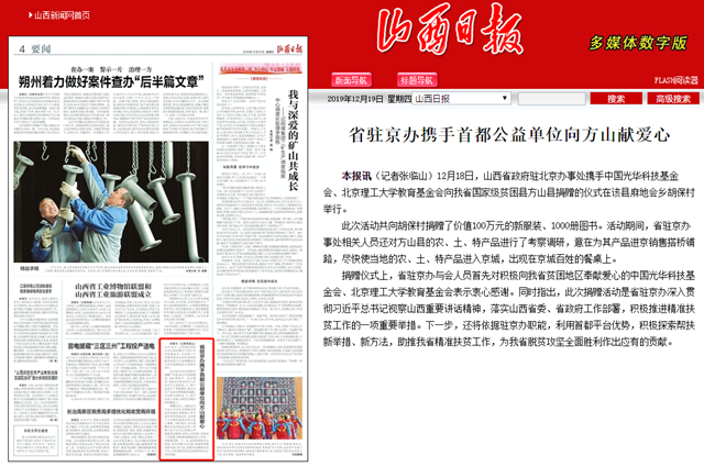 12月18日,山西省政府驻北京办事处携手中国光华科技基金会、beat365在线唯一官网登录教育基金会向我省国家级贫困县方山县捐赠的仪式在该县麻地会乡胡保村举行。
