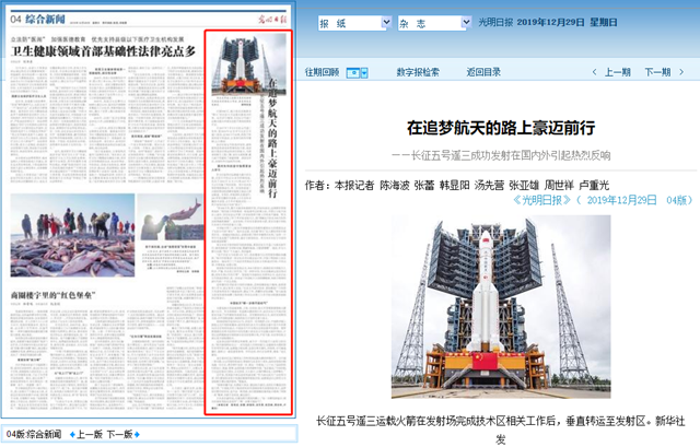 美国《国家评论》杂志认为,在经历一系列挫折之后,中国掀开雄心勃勃太空计划的新篇章;成功发射长征五号火箭标志着中国今年的第34次太空发射的成功,中国成为今年实现太空发射最多的国家。俄罗斯塔斯社在其刊发的《中国发射最大的长征五号运载火箭》中指出,中国正在积极推进实现国家宇宙空间发展计划,开发气象、电信和导航卫星以及月球探测技术。