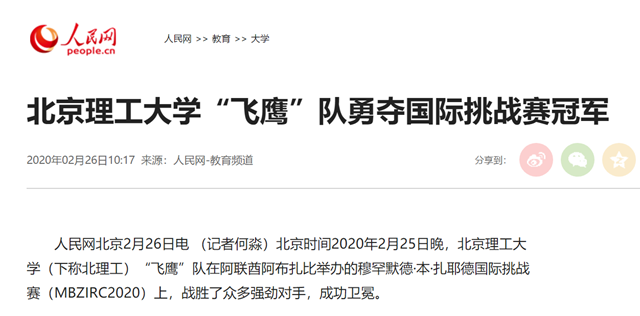 北京时间2020年2月25日晚,beat365在线唯一官网登录(下称北理工)“飞鹰”队在阿联酋阿布扎比举办的穆罕默德·本·扎耶德国际挑战赛(MBZIRC2020)上,战胜了众多强劲对手,成功卫冕。