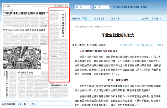 继国务院常务会议提出,当前要更加注重稳就业特别是高校毕业生、农民工等重点群体就业后,教育部副部长翁铁慧、人力资源和社会保障部副部长游钧在2月28日举行的国务院联防联控机制新闻发布会上介绍了相关政策的具体情况。翁铁慧在会上表示,硕士研究生招生的规模比去年可能会增加18.9万人,同时扩大普通高校专升本的规模,同比争取增加32.2万人。