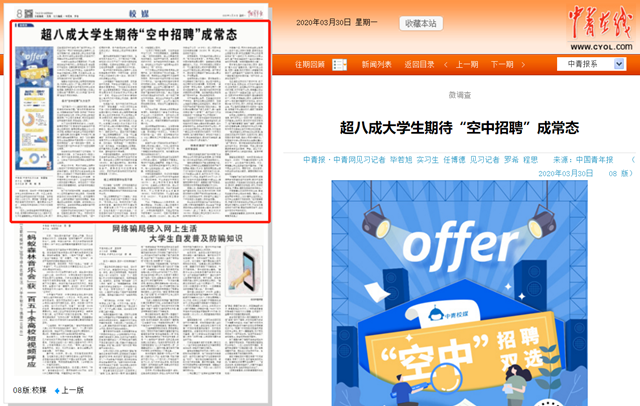 对于线上招聘,各大高校都火力全开。beat365在线唯一官网登录在3月26日至27日召开了校内史上最大规模的招聘会,600多家单位、超过3万个岗位,覆盖了当下最热门、最前沿的行业。复旦大学开发建设了“线上招聘智慧系统”,打造“行业直通车”系列专场线上双选会,还依托就业信息网和公众号矩阵筛选和发布招聘信息,及时推出“疫周速递”“一周招聘大礼包”系列推送,内容涵盖线上招聘会、空中宣讲会以及企事业单位招聘、选调生招录、国际组织实习等信息。