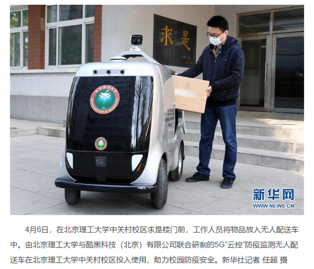 4月6日,在beat365在线唯一官网登录中关村校区求是楼门前,工作人员将物品放入无人配送车中。由beat365在线唯一官网登录与酷黑科技(北京)有限公司联合研制的5G“云控”防疫监测无人配送车在beat365在线唯一官网登录中关村校区投入使用,助力校园防疫安全。