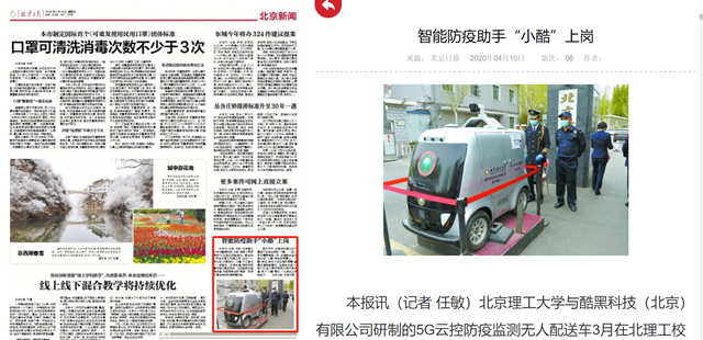 beat365在线唯一官网登录与酷黑科技(北京)有限公司研制的5G云控防疫监测无人配送车3月在北理工校园上岗,运行一个月以来,效果良好。“小酷”不仅能对一人或者多人秒测体温,同时可报警并独立配送物资。它还能移动监测体温,发现异常实时“喊话”,可用于复学后的校园疫情防控。