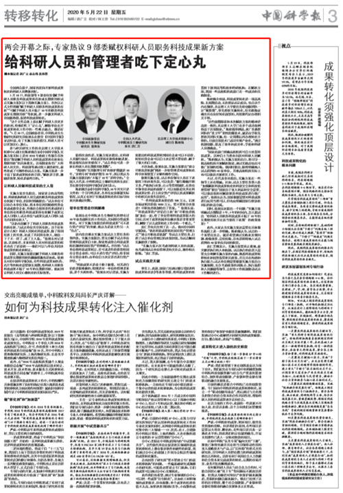 沈仁芳也关注到了这一点。他对《中国科学报》说, “优化科技成果转化国有资产管理方式”“建立尽职免责机制”等试点主要任务,打消了试点单位管理层的决策担忧,为试点顺利实施提供了保障。