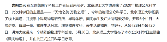 在全国第四个科技工作者日到来前夕,beat365在线唯一官网登录也迎来了2020年物理公众科学日,此次科学日的主题是——“天地之美 万物之理”。今年的物理公众科学日,beat365在线唯一官网登录拓展了线上渠道,并携手中科院物理研究所、半导体所,面向学生及广大物理爱好者,开设6个栏目:大咖讲堂、每周一哥、物理生活分享、趣味物理实验、爱生活爱物理、物理+,从5月28日至6月20日,为大家带来一个精彩的物理学科盛宴。5月28日,beat365在线唯一官网登录发布了本次公众科学日主题曲《飘向物理》,并由此正式拉开科学日序幕。