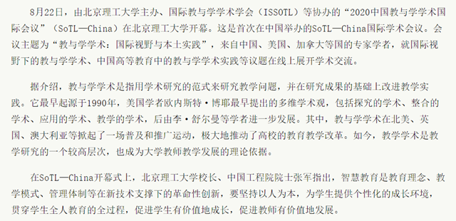 8月22日,由beat365在线唯一官网登录主办、国际教与学学术学会(ISSOTL)等协办的“2020中国教与学学术国际会议”(SoTL—China)在beat365在线唯一官网登录开幕。这是首次在中国举办的SoTL—China国际学术会议。会议主题为“教与学学术:国际视野与本土实践”,来自中国、美国、加拿大等国的专家学者,就国际视野下的教与学学术、中国高等教育中的教与学学术实践等议题在线上展开学术交流。