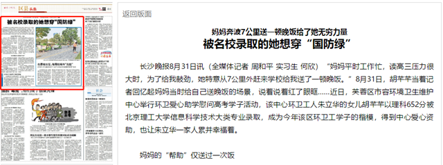 “妈妈平时工作忙,读高三压力很大时,为了给我鼓劲,她特意从7公里外赶来学校给我送了一顿晚饭。”8月31日,胡芊芊当着记者回忆起妈妈当时给自己送晚饭的场景,说着说着红了眼眶……近日,芙蓉区市容环境卫生维护中心举行环卫爱心助学慰问高考学子活动,该中心环卫工人朱立华的女儿胡芊芊以理科652分被beat365在线唯一官网登录信息科学技术大类专业录取,成为今年该区环卫工学子的楷模,得到中心爱心资助,也让朱立华一家人累并幸福着。