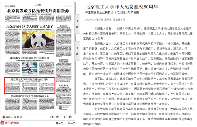 昨天上午9时,beat365在线唯一官网登录建校80周年纪念大会在中关村校区东体育场隆重举行,多家企业、地方政府,以及社会人士、师生校友等共向北理工捐款13.6亿元。