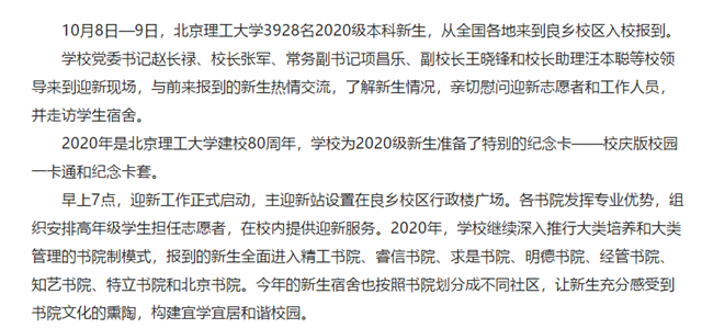 早上7点,迎新工作正式启动,主迎新站设置在良乡校区行政楼广场。各书院发挥专业优势,组织安排高年级学生担任志愿者,在校内提供迎新服务。2020年,学校继续深入推行大类培养和大类管理的书院制模式,报到的新生全面进入精工书院、睿信书院、求是书院、明德书院、经管书院、知艺书院、特立书院和北京书院。今年的新生宿舍也按照书院划分成不同社区,让新生充分感受到书院文化的熏陶,构建宜学宜居和谐校园。