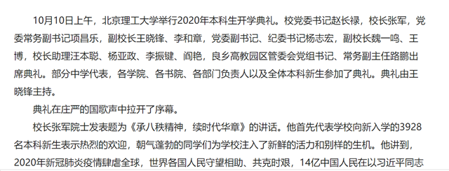 校长张军院士发表题为《承八秩精神,续时代华章》的讲话。他首先代表学校向新入学的3928名本科新生表示热烈的欢迎,朝气蓬勃的同学们为学校注入了新鲜的活力和别样的生机。他讲到,2020年新冠肺炎疫情肆虐全球,世界各国人民守望相助、共克时艰,14亿中国人民在以习近平同志为核心的党中央坚强领导下,创造了人类与疾病斗争史上的奇迹;今年也是北理工建校80周年,从延安走来的一代代北理人,栉风沐雨、砥砺前行,走出了一条中国共产党创办和领导中国特色高等教育的“红色育人路”,一条矢志国防、服务战略的“强军报国路”,一条开放包容、交叉融合的“创新发展路”,以实干笃行的精神在建设中国特色世界一流大学的进程中书写“奋进之笔”。他勉励新生一要立志立德,苦干实干,做胸怀壮志、爱国奋斗的新时代青年;二要学精学深,笃实求是,做明德精工、执着追梦的新时代青年;三要创新创造,敢为人先,做创新包容、笃实力行的新时代青年;四要时代担当,不辱使命,做勇于奉献、堪当大任的新时代青年。他深切寄语新一代北理工学子,要与国家同楫同舟,与时代同向同行,成长为“胸怀壮志,明德精工,创新包容,时代担当”的领导领军人才,为实现中华民族伟大复兴、构建人类命运共同体贡献力量,做引领时代的中流砥柱、民族复兴的坚实脊梁!