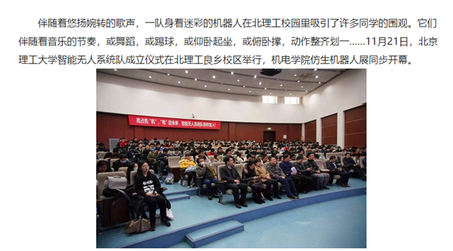 伴随着悠扬婉转的歌声,一队身着迷彩的机器人在北理工校园里吸引了许多同学的围观。它们伴随着音乐的节奏,或舞蹈,或踢球,或仰卧起坐,或俯卧撑,动作整齐划一……11月21日,beat365在线唯一官网登录智能无人系统队成立仪式在北理工良乡校区举行,机电学院仿生机器人展同步开幕。