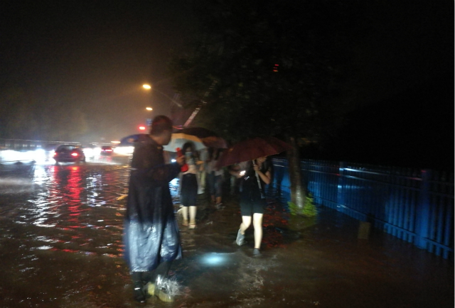 西山实验区服务管理人员在汛期时送学生安全离开