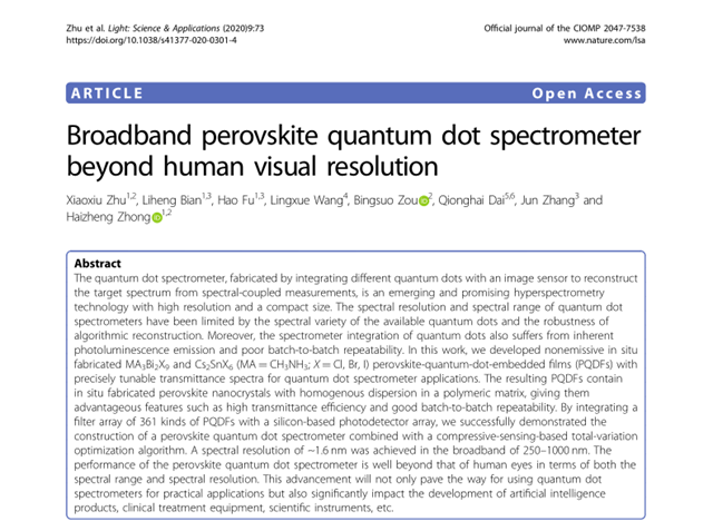 钟海政、边丽蘅等将关于“超越人眼的量子点超光谱仪”研究成果发表于《Nature》子刊