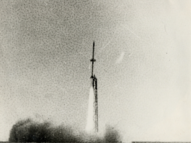 (北京工业学院研制中国首枚二级固体高空探测火箭“东方-1号”发射瞬间) 1958年9月8日下午两点,河北宣化,“点火”令下,...