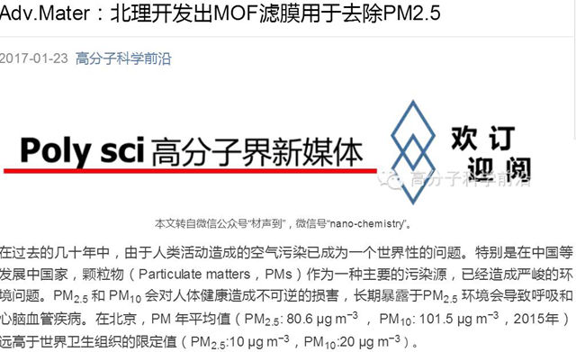 【高分子科学前沿微信公众平台】Adv.Mater:北理开发出MOF滤膜用于去除PM2.5