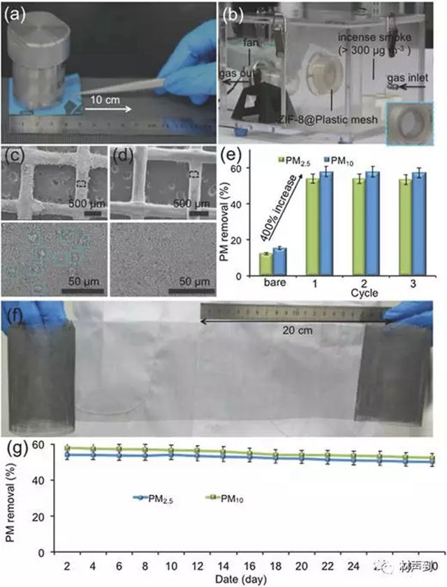 图4 ZIF-8@塑料网材料表征和去除 PM 性能测试