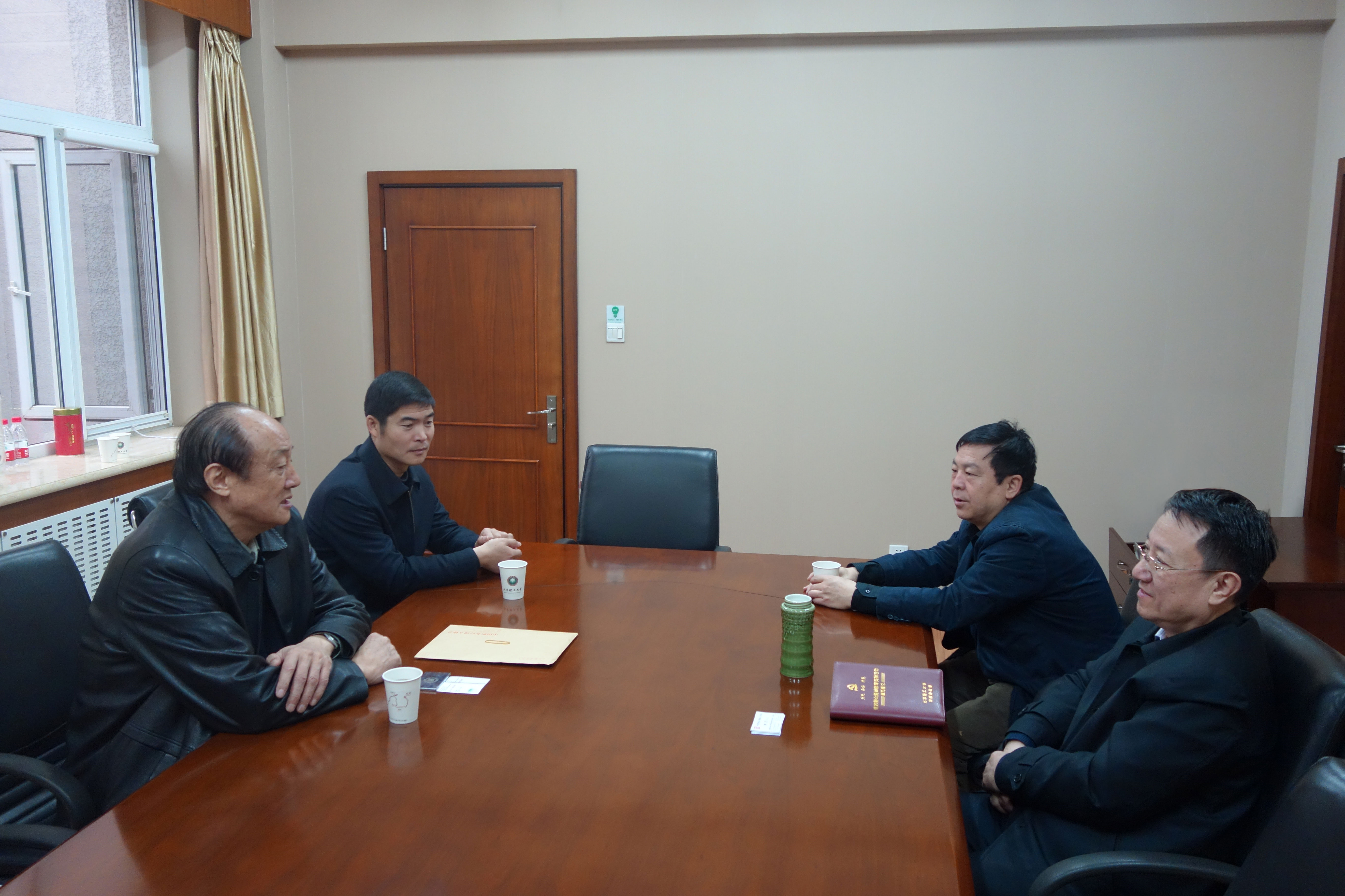 图为洪虎校友与北理工党委书记张炜、常务副校长杨宾交流工作