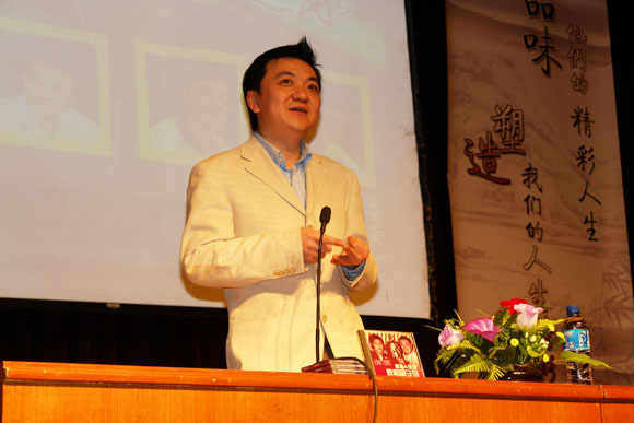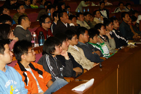 精彩的演讲不时赢得大家热烈的掌声。在提问环节,同学们踊跃提问,阐述自己的观点,董先生都友善而风趣的予以回答。最后,由董路先生抽出了本场讲座的幸运观众,获得由董路先生签名的个人CD和北京爱国者大学生足球队中甲北理首次主场(本月21日)的入场券。