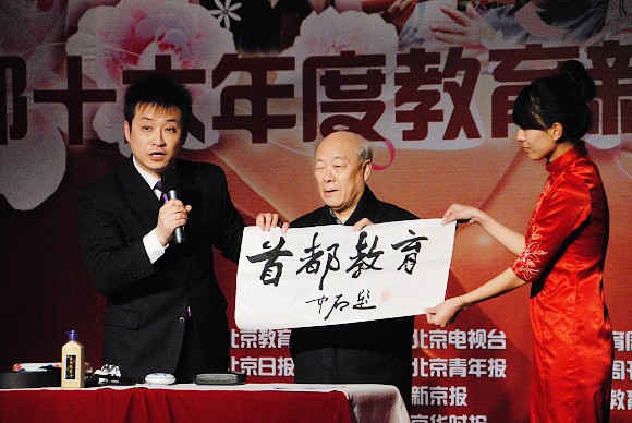 颁奖典礼上,欧阳中石老先生现场泼墨,书写了“首都教育”四个大字。“我这几个字写得很不好,我做得也不是很好,我觉得我很惭愧接受这个称号。”作为最年长的获奖者,欧阳中石先生的获奖感言最为自谦。