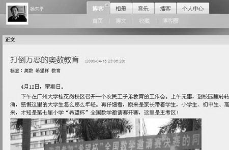 此外,一ID为“翻越心灵的刀锋”的网友也在其个人博客上发表文章,反驳杨东平“打倒万恶的奥数教育”之说。“首先,奥数本来就是一种竞赛,就像奥林匹克运动会,总会有非比寻常的游戏玩家,自然就不是所有人都可以参加。”网友“翻越心灵的刀锋”说,“另外,参加一个高水平游戏,必定是要接受严格训练的。”