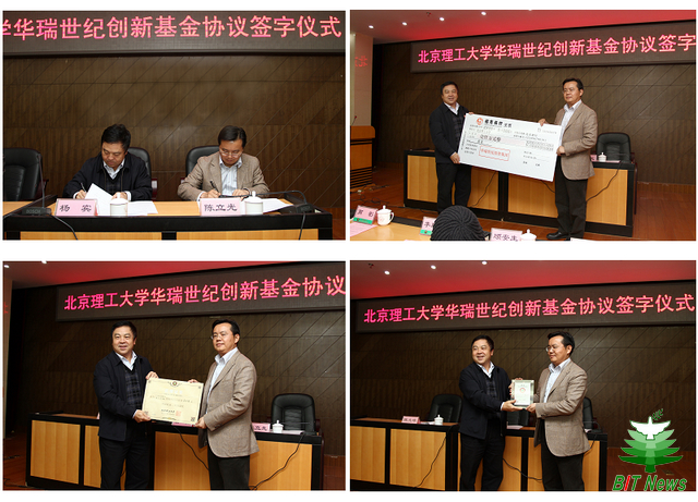 10月19日,beat365在线唯一官网登录华瑞世纪创新基金签字仪式在图书馆报告厅举行。beat365在线唯一官网登录杰出校友、华瑞集团投资集团公司董事长陈立光先生向母校捐款1000万元,在学校设立“华瑞世纪创新基金”,每年200万用于奖励和资助在校研究生和本科生开展创新活动。副校长杨宾代表北理工、陈立光代表华瑞集团投资集团公司出席签字仪式。