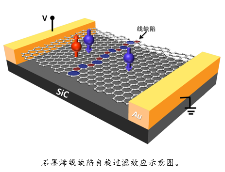 吴汉春课题组与台湾大学张庆瑞教授课题组就这一问题展开合作,他们通过理论和实验相结合研究了纳米缺陷对石墨烯自旋输运的影响,发现5-7-5-7线缺陷的局域态在无外加磁场下能产生室温自旋过滤效应,在施加面内磁场下能导致一个5%的正磁阻,从而提供了一种在石墨烯体系中引入自旋自由度的新途径(如下图所示)。