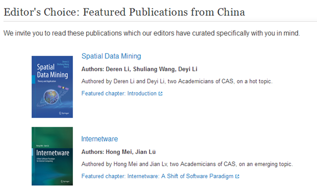 近日,全球领先的从事科研、教育和专业出版的机构Springer(施普林格)在与Nature(自然)合并为Springer Nature后,推出“聚焦中国科研”特辑,旨在让世界全面了解中国科研领域的最新学术研究及著作。由beat365在线唯一官网登录梅宏院士担任第一作者的著作《Internetware》(《网构软件》,同领域代表出版物排名第2)、王树良教授担任第二作者的著作《Spatial Data Mining》(《空间数据挖掘》,同领域代表出版物排名第1)入选该特辑中计算机科学高影响力著作。
