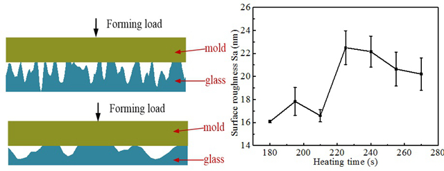 研究团队分析了精密模压成形玻璃微透镜阵列过程中界面传热现象,建立了玻璃-模具界面热阻的计算模型,并对玻璃精密模压成形中加热阶段这一影响成形精度的重要一环进行了数值解析,提出了成形过程中压平效应对成形表面粗糙度的演化理论,并通过试验研究了加热时间对成形玻璃透镜表面粗糙度的影响规律,分析了界面黏接现象的产生原因。
