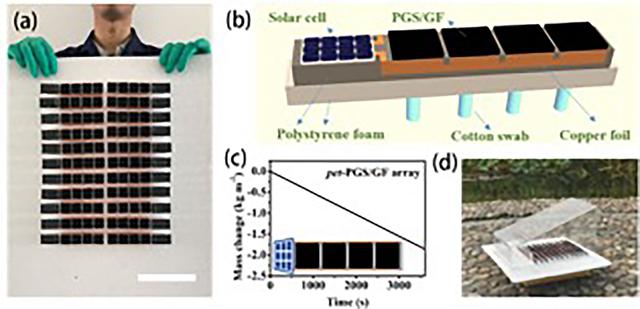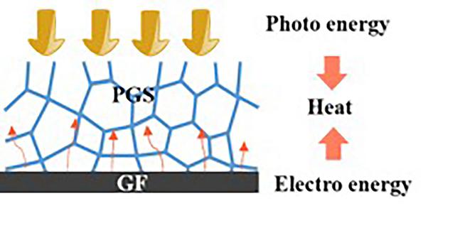 这种石墨烯复合结构由多孔石墨烯(PGS)和石墨烯箔(GF)组成。PGS部分接收太阳能实现光热转换,同时多孔结构可以提供有效的水蒸发通道。GF具有较高的导电性并与太阳能电池板连接,在太阳光照射下,太阳能电池板产生电能,GF由于具有较好的电热性能会产生热量,进而可以提高材料的温度,有效地提高水蒸发速率。
